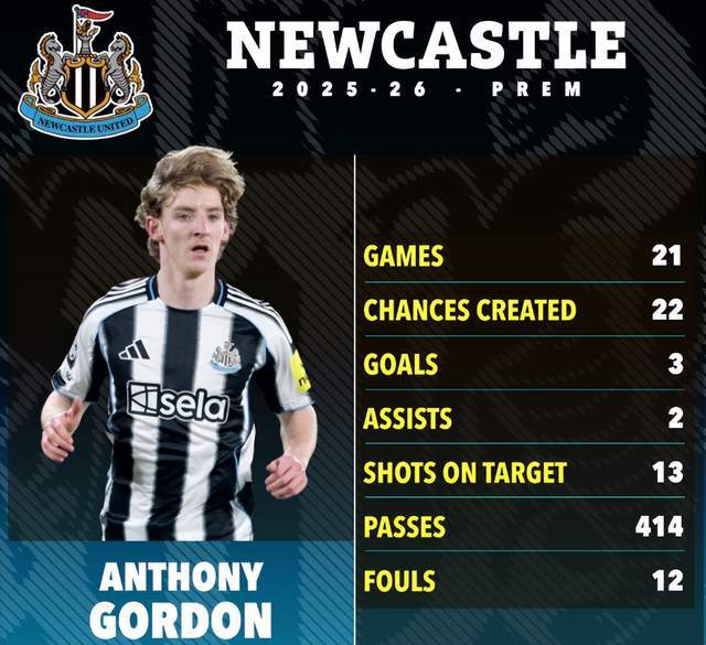 戈登身高1米83,司職左邊鋒,也能踢中鋒。2025-26賽季,戈登在英超21場(chǎng)貢獻(xiàn)3球2助,發(fā)揮起伏不定。不過在歐冠,戈登10次出場(chǎng)打進(jìn)10球,射手榜上僅次于13球的姆巴佩。戈登也是英格蘭現(xiàn)役國(guó)腳,代表三獅軍團(tuán)出場(chǎng)16次打進(jìn)2球,有望出戰(zhàn)2026年世界杯。