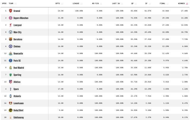 歐冠奪冠概率:阿森納27.48%斷層領(lǐng)先!拜仁排第二,皇馬僅第九